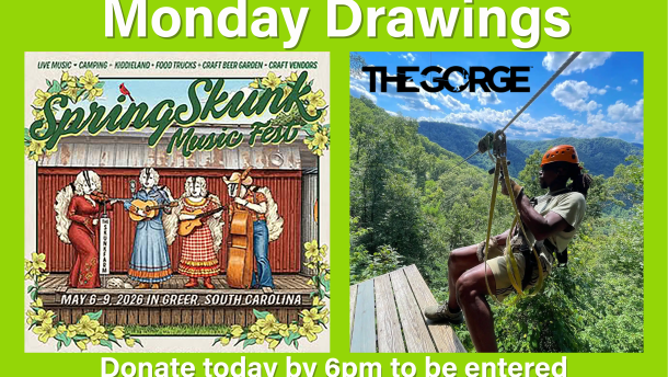 Click "Donate" above, or call us today until 6pm at 1-800-245-8870 to be entered into drawings for passes for two with camping to Albino Skunk Music Festival and four zipline passes from The Gorge, in Saluda, NC.