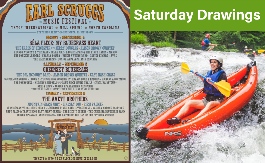 securely online at wncw.org, or call us today until 6pm at 1-800-245-8870. And if you donate by 6pm tonight, you will be entered into drawings for a pair of 3-day Grandstand passes to the Earl Scruggs Music Festival and 4 one-day White Water Adventure passes to Green River Adventures. If you have already donated during our Pre-Drive week or are a monthly sustainer, you have been entered into this and all daily drawings. A donation is not required to enter (but it will give you good karma!). Send an email with "Enter me in the contest only" in the subject line to pledge@wncw.org.