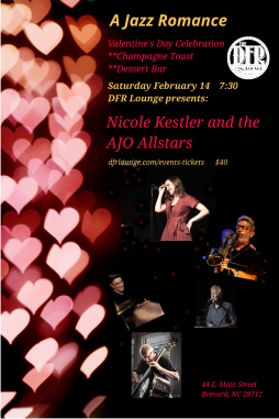 Love and Romance are in the air! Enjoy a Champagne toast and dessert table while you and your sweetheart bask in the luscious vocals of preeminent jazz singer, Nicole Kestler. A recent Chicago transplant, her unique, fresh take on jazz classics and warm audience rapport, have made her a hit in Western NC! Nicole is backed by members of the Asheville Jazz Orchestra, WNC premiere BigBand.