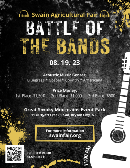 We are excited to announce the Swain County Agricultural Fair’s inaugural “Battle of the Bands,” a four-hour music contest at the Great Smoky Mountains Event Park. This is set to take place on Saturday, August 19th beginning at 11:00 a.m. The Battle of the Bands will feature six bands who are finalists competing for prize money.