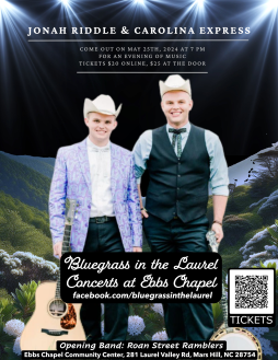 Bluegrass in the Laurel is a series of concerts held at the beautiful historic Ebbs Chapel Community Center Performing Arts Center in the Laurel Country of Madison County. The series aims to celebrate the roots music of Western North Carolina and Upper East Tennessee and raise funds for the Ebbs Chapel Community Center.