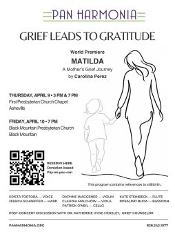 Framed with instrumental works by Pierre Max Dubois (Petite Suite) and Fratres by famed Estonian minimalist composer Arvo Pärt, the centerpiece of this special, very intimate program is the world-premier of Asheville-based composer Carolina Perez’s song cycle: Matilda: A Mother’s Grief Journey After Stillbirth.